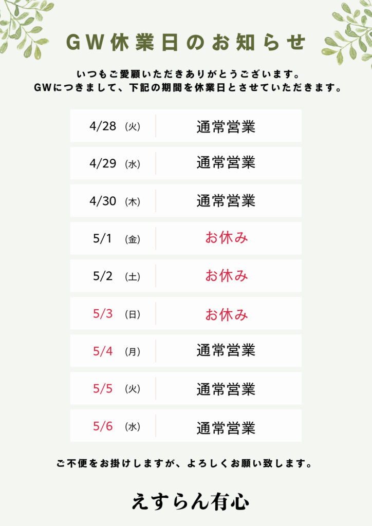 誠に勝手ながら、下記の通りゴールデンウィーク休業とさせていただきます。